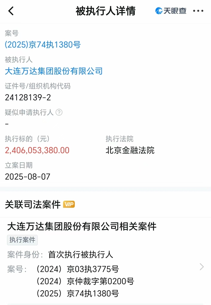天眼查APP贯通,近日万达集团被列入被现实东谈主,现实方向荒谬24亿元,现实法院为北京金融法院。